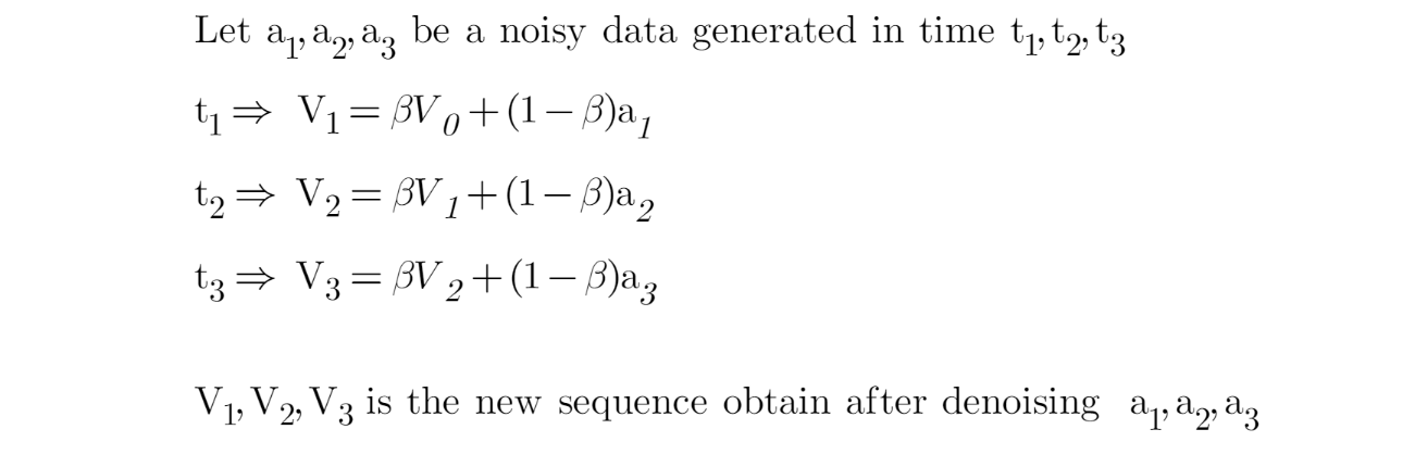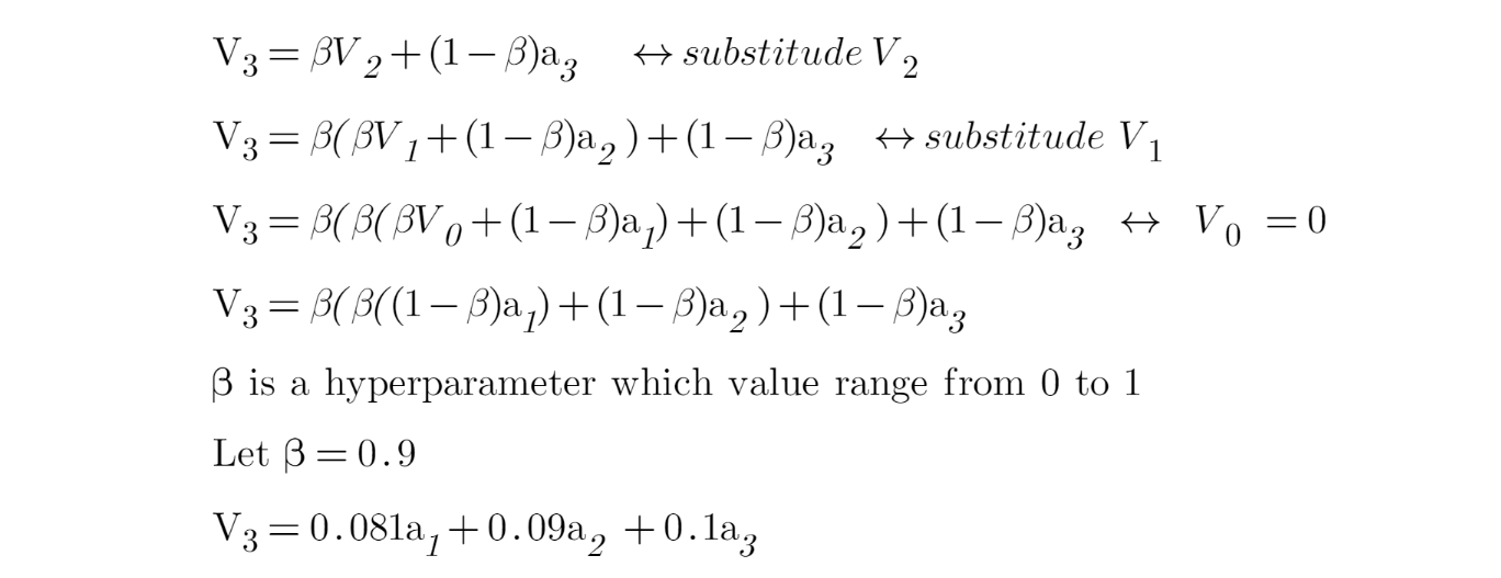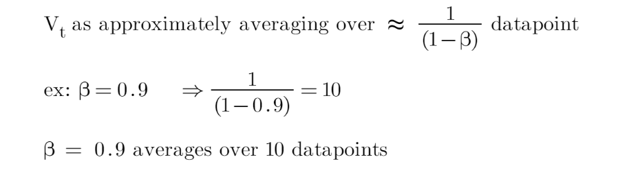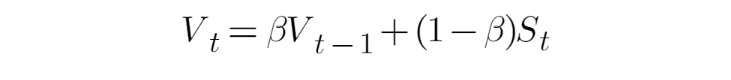 Vt is some smoothen value at point t, while St is a data point at point t. B here is a hyperparameter that we need to tune in our network. So, the choice of B will determine how many data points that we average the value of Vt as shown below: