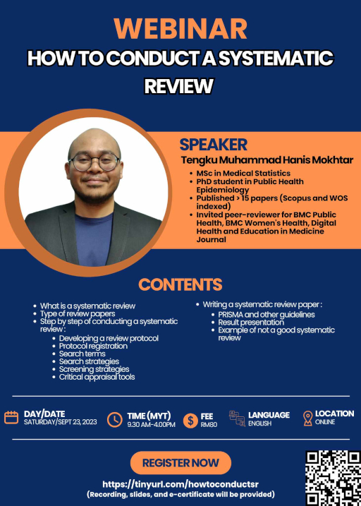 A systematic review is a rigorous and comprehensive approach to summarizing and analyzing existing research on a specific topic or question. It involves a systematic and structured search of the available literature, followed by a meticulous appraisal and synthesis of relevant studies. Systematic reviews are widely used in evidence-based practice and research to provide a high-quality and unbiased overview of the current state of knowledge on a particular subject, helping inform decision-making and policy development. This webinar covered step-by-step how to conduct a systematic review. The slides and recording of the webinar is available for purchase at Jom Research website.